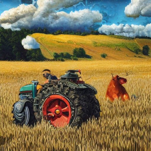 A striking picture of a rural farm scene with golden wheat fields, a brook, and a pond. This fantasy landscape has a painterly aesthetic with expressive brushstrokes and warm golden light.