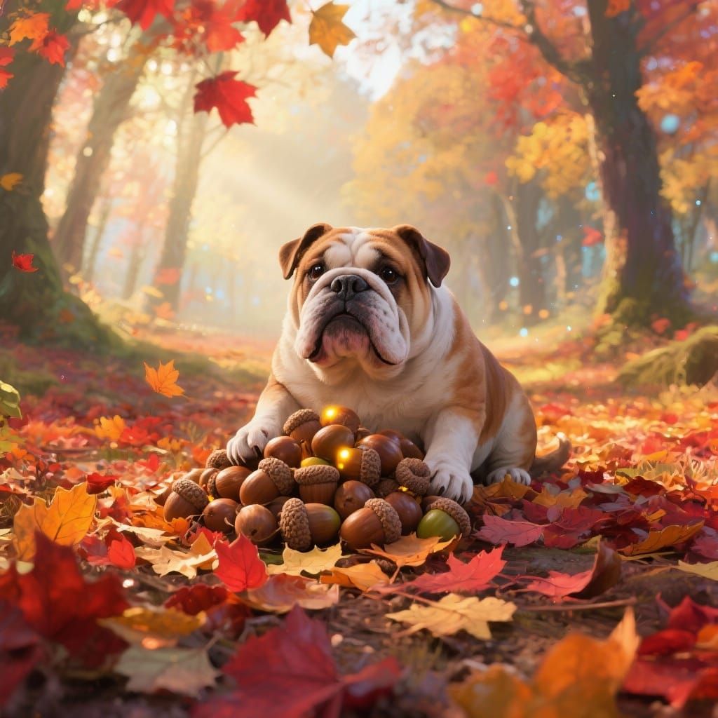 This image shows a fluffy English bulldog guarding glowing acorns in a sun-dappled autumn forest. The scene has a magical, serene atmosphere with vibrant colors and detailed natural elements, rendered in a painterly fantasy style.