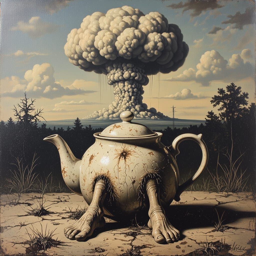 This image shows a vintage teapot with human legs emerging from its base, set against a background of a nuclear mushroom cloud. Rendered in a dark, surrealist oil painting style with heavy textures.
