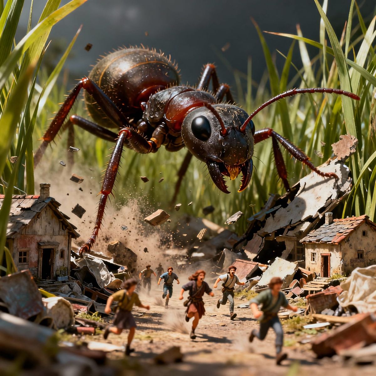 High fantasy matte painting, close-up, tiny citizens flee towards the viewer in terror from a miniature village naturally constructed among detritus at the base of tall grasses as an enormous ant marches through demolishing buildings with its mandibles. meticulously detailed high fantasy art, bold striking ...