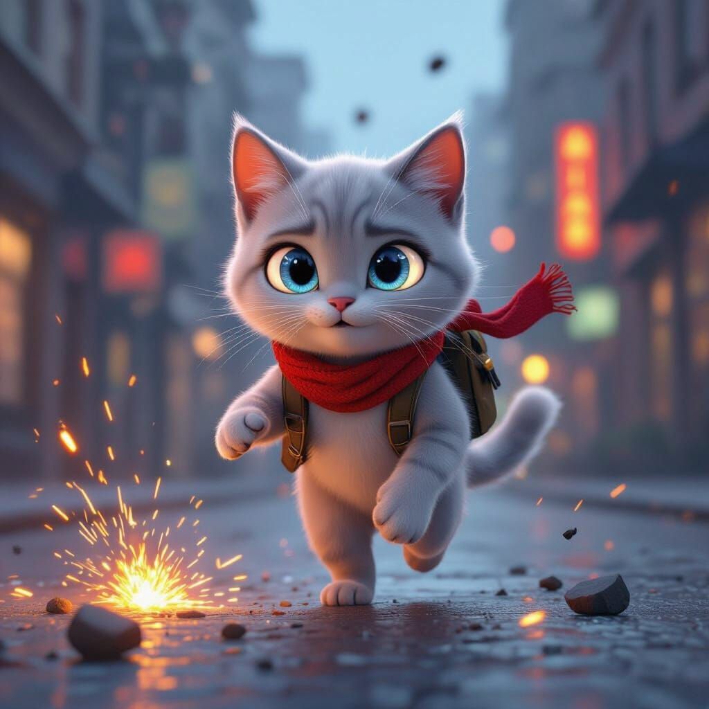 This image shows a light-gray cat with blue eyes and a red scarf running through city streets. The cat, wearing a backpack, dodges sparks in a 3D Disney Pixar style.
