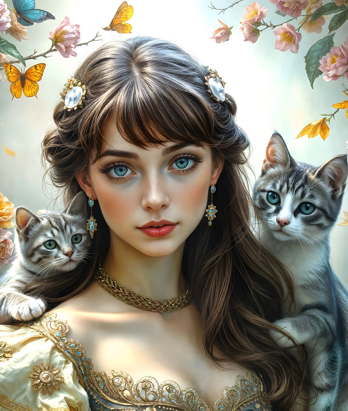 This image shows a stunning queen of cats, a woman with blue eyes and light brown hair, in an elaborate dress. The artwork blends idealized naturalism with soft, atmospheric backgrounds, reminiscent of tonalist oil paintings.