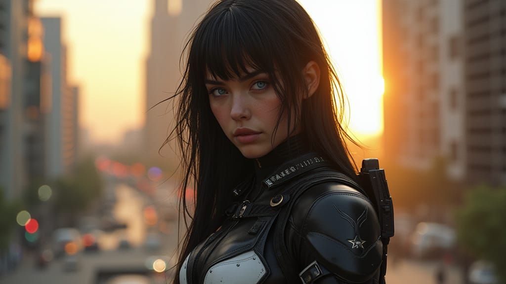 A striking picture of a cyberpunk warrior woman in a futuristic cityscape at dawn. She has an athletic build, wears a black and white nanosuit, and features advanced robotic vision in hyperrealistic detail.