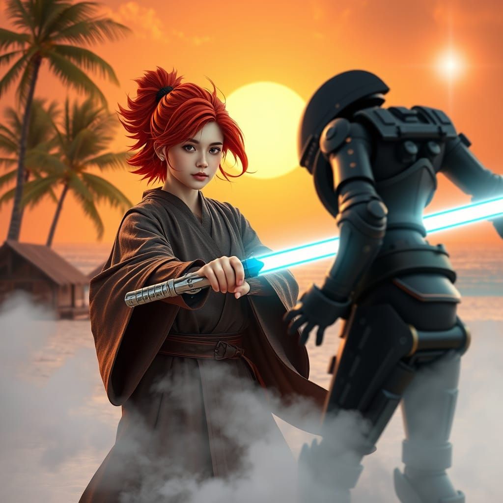A striking picture of a Jedi knight on a Hawaiian beach preparing to battle a dark side android. The scene is bathed in the warm glow of sunset, rendered with vibrant, anime-inspired details.