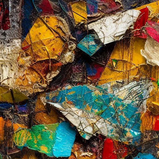 A vibrant mixed media assemblage of food on oiled paper. The artwork features intricate layers and textures, with a Cubist influence. The lighting accentuates the rich, tactile earth tones.