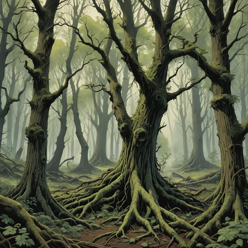 A comic book style image of scarred hemlock roots, oaks, and willow-shoots, representing Spring. Aspens are grouped between them, rendered with smooth lines and a slightly frightened aesthetic.