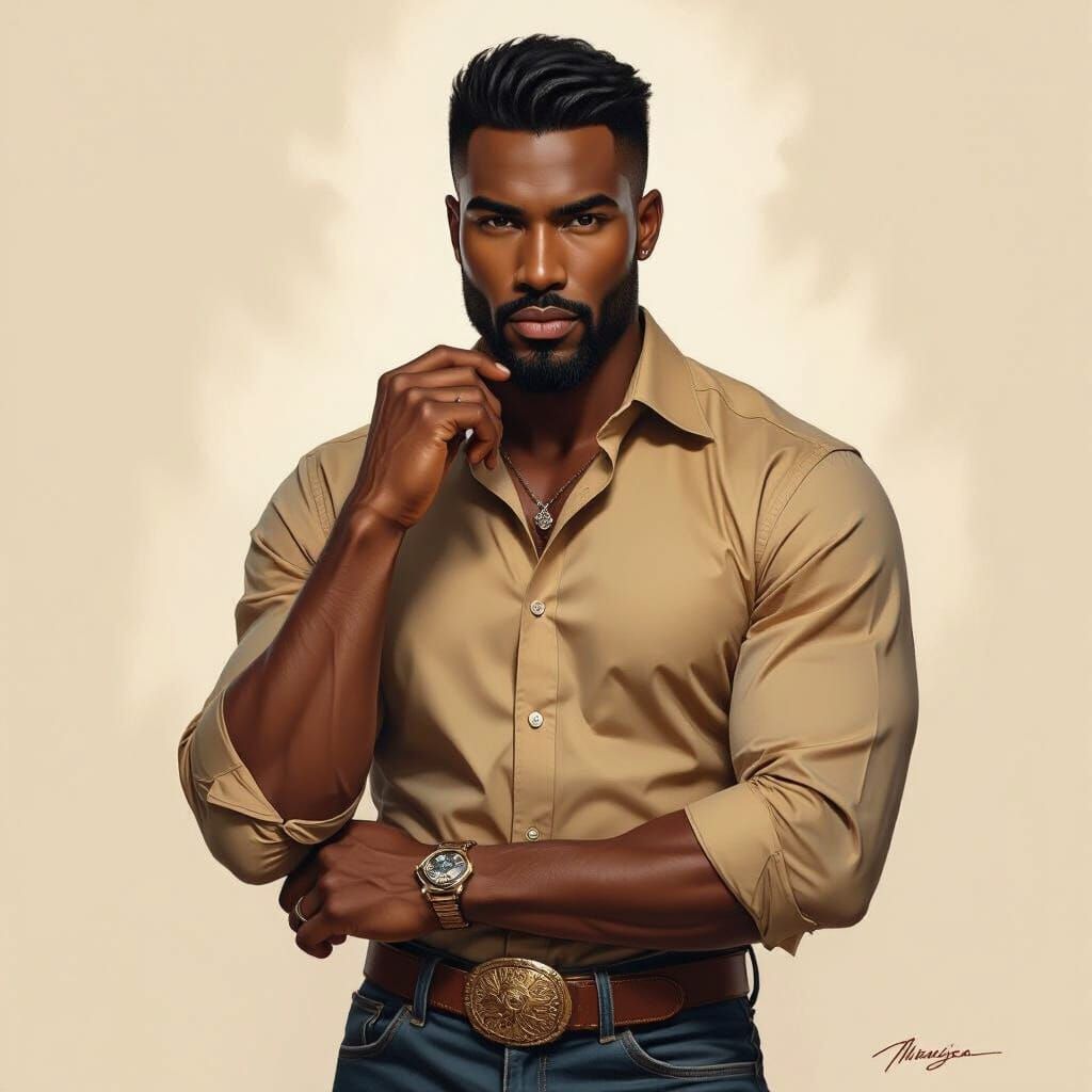 This digital painting showcases a handsome, muscular Black man with a goatee, styled hair, and a chiseled jaw. He wears a tan shirt and jeans, posing thoughtfully in a dramatic, desaturated fantasy art style.