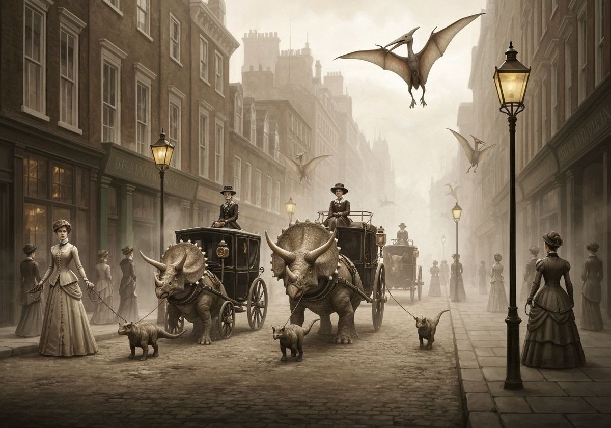 A bustling Victorian London street where elegant ladies in long dresses walk small dinosaurs on leashes, and carriages are pulled by triceratops wearing ornate harnesses. Pterodactyls perch on rooftops, and fog swirls around gas lamps. Style: semi-realistic digital painting with rich atmospheric perspective, ...