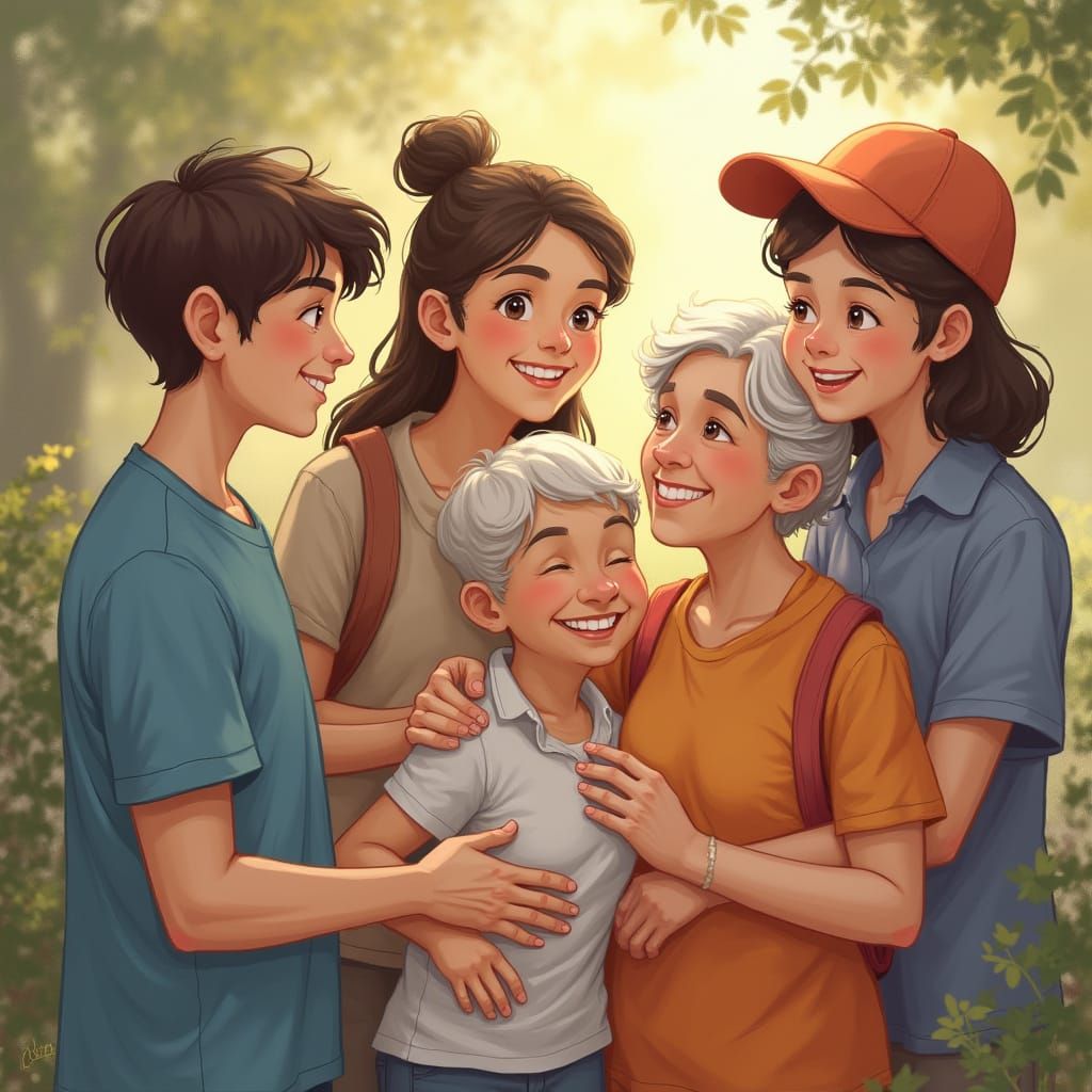 This image shows a heartwarming scene of young people helping elderly individuals with care, set against a soft natural background with warm colors reminiscent of impressionist art, featuring delicate brushstrokes and whimsical details.