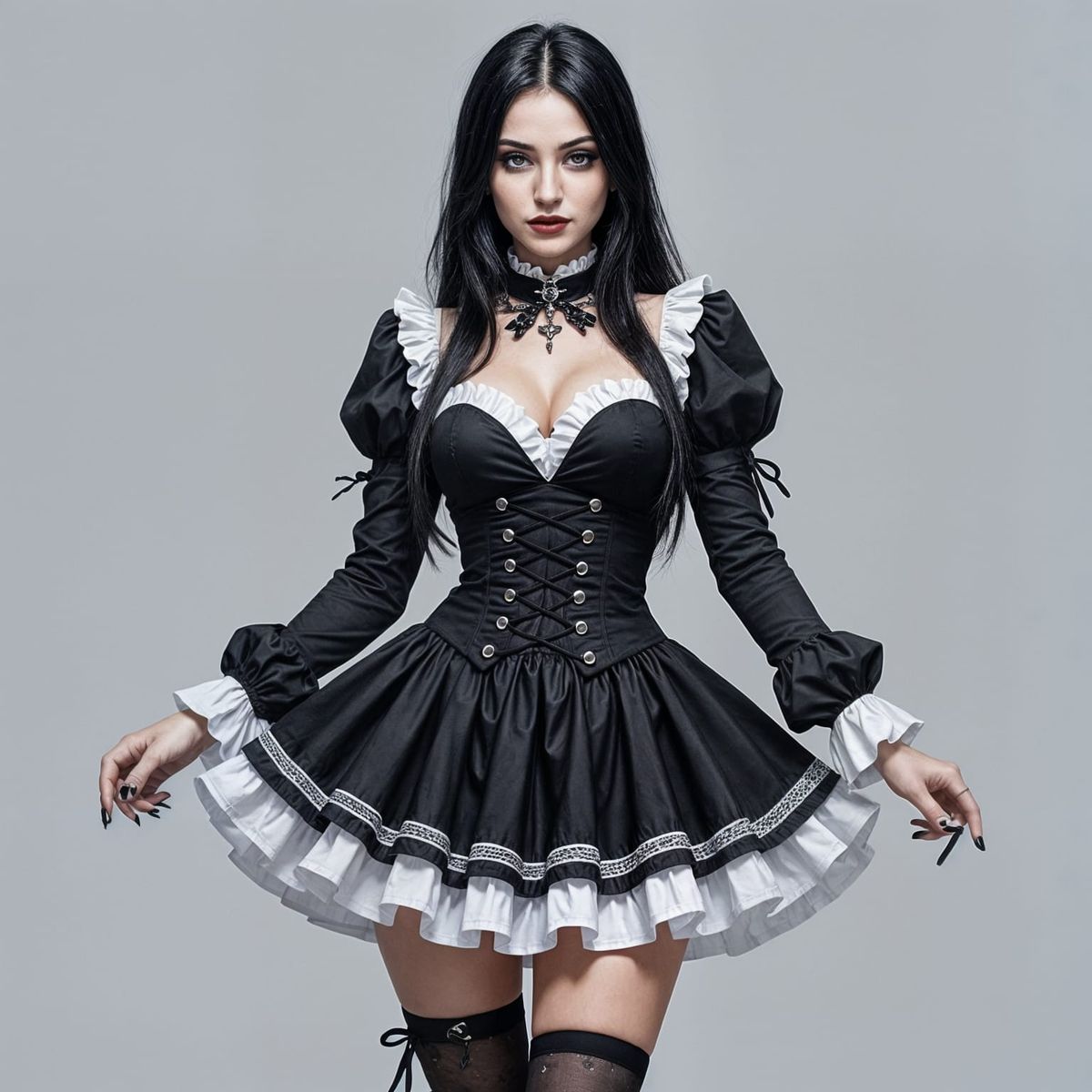 This image features a striking goth woman wearing a black and white mini skirt. The aesthetic blends dark fashion with a minimalist color palette for a captivating look.