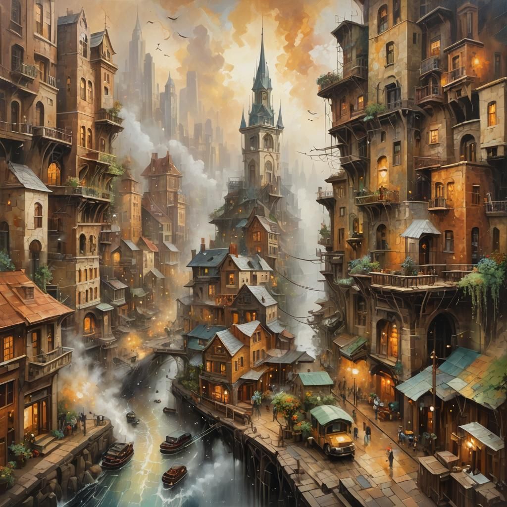 "Abstract diluted oil painting. Cityscape Random shapes, random lines, small shapes, small intricate lines, interwoven organic strokes and k...