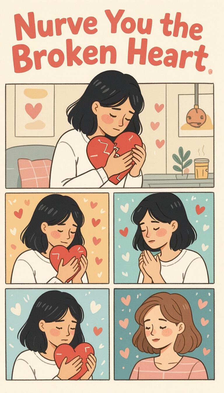 This image shows a comic-strip style infographic about healing a broken heart. Six panels illustrate sequential steps with soft pastel colors and bold lines, in a gentle, empathetic tone.