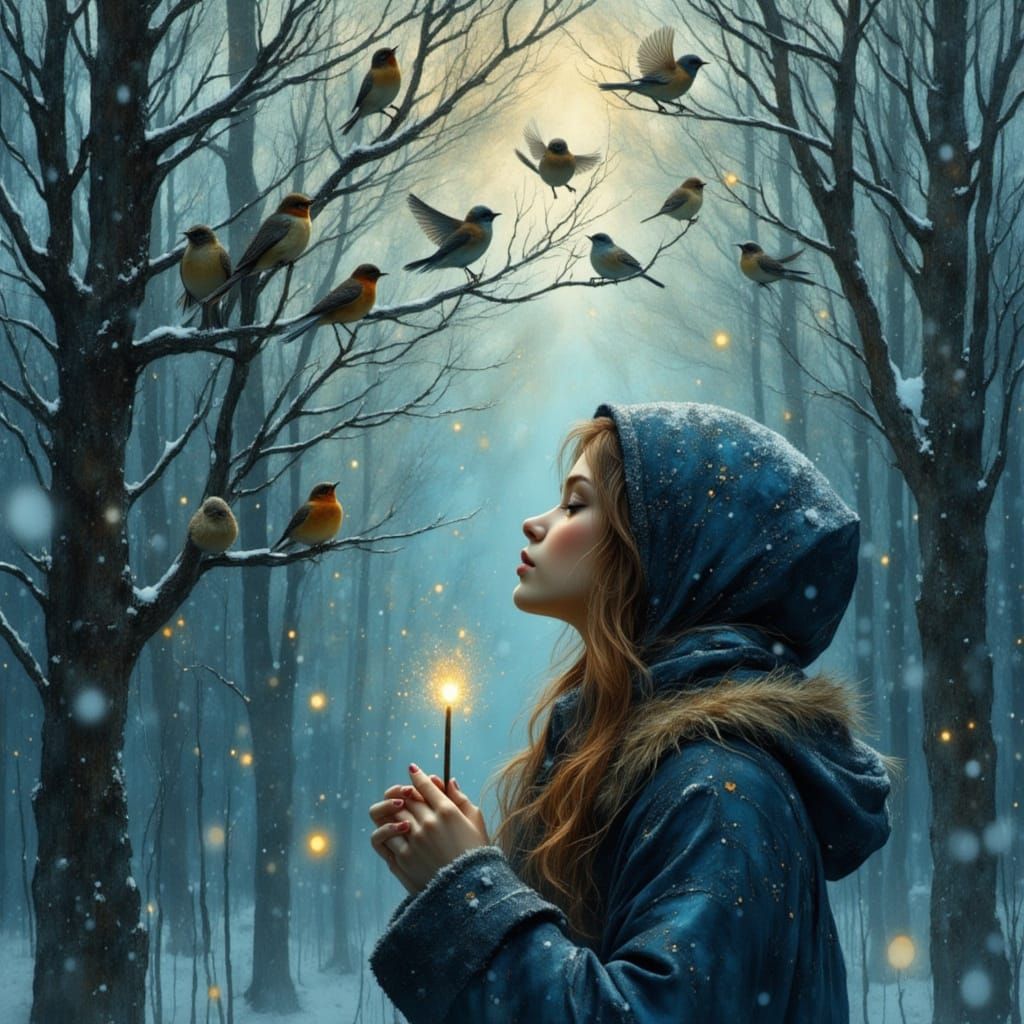 This fantasy illustration depicts a young girl in a detailed winter coat, holding a magic wand amidst falling snow. Birds perch on bare branches as dramatic light filters through the forest.