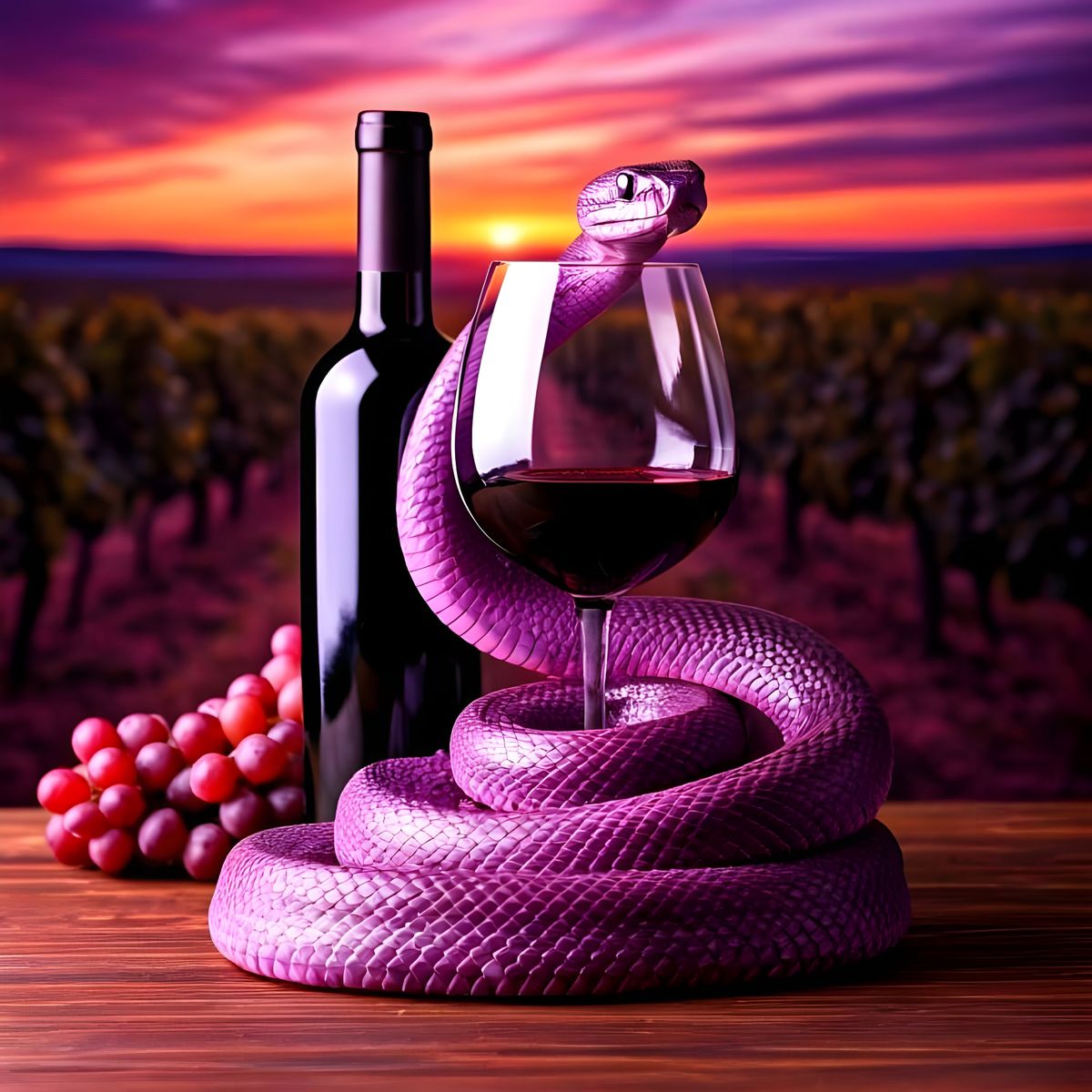 A photorealistic image of a purple snake coiled around a wine glass on a wooden table, set against a backdrop of a vineyard with purple grapes and a sunset sky, all bathed in deep, rich purple lighting.