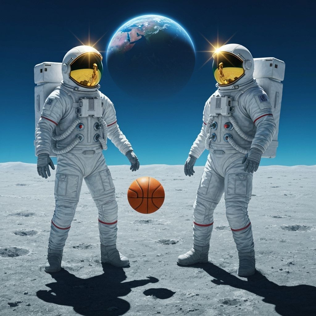 A vivid image showing astronauts playing basketball on the moon, with Earth in the background. The scene is rendered with hyperrealistic detail and nostalgic charm, reflecting sunlight in shimmering highlights, in a retro science fiction style.