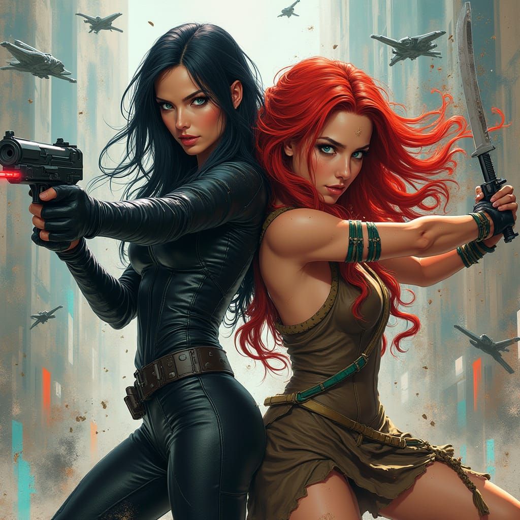 This image shows two powerful women warriors amidst a city under attack. The image is rendered in a vibrant, graffiti-inspired style, combining splash art and street art elements with high contrast and colorful hues.