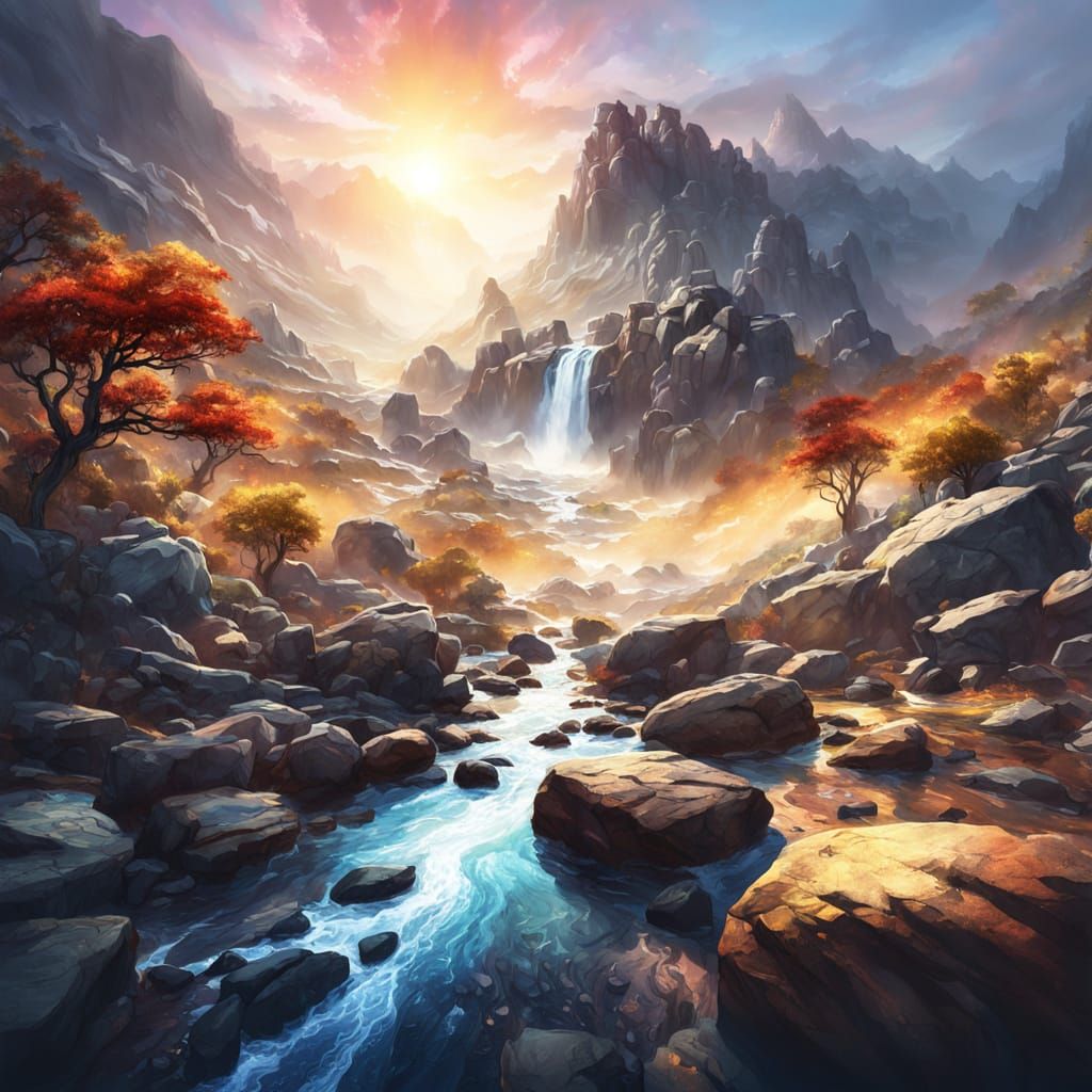 A vibrant digital painting of water flowing through a rocky landscape. Golden hour light and mist create a cinematic and breathtaking scene in triadic colors.