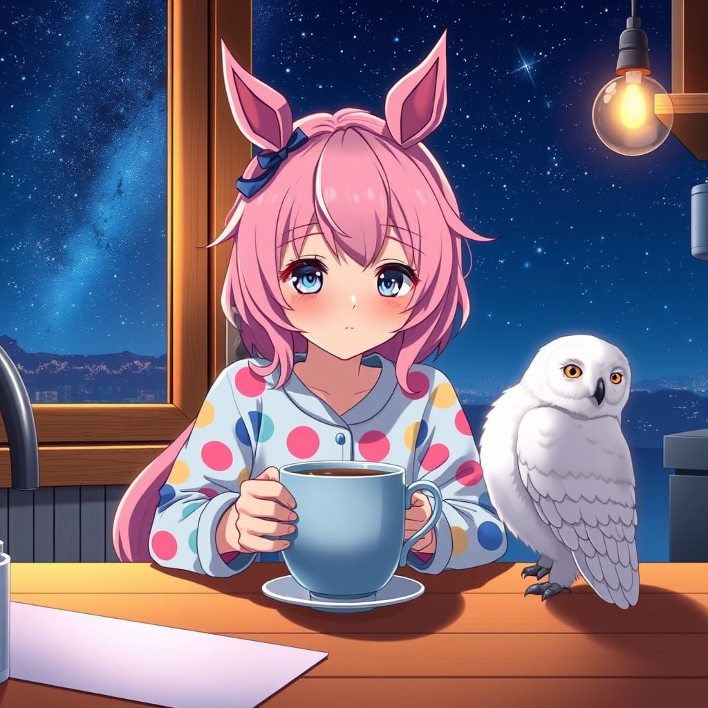 This image features a pastel-haired girl with horse ears, dressed in colorful spotted pajamas, sitting in a cozy night kitchen surrounded by soft lighting and a starry night sky. The scene is rendered in a cel-shaded anime style with bold colors and deep shadows.