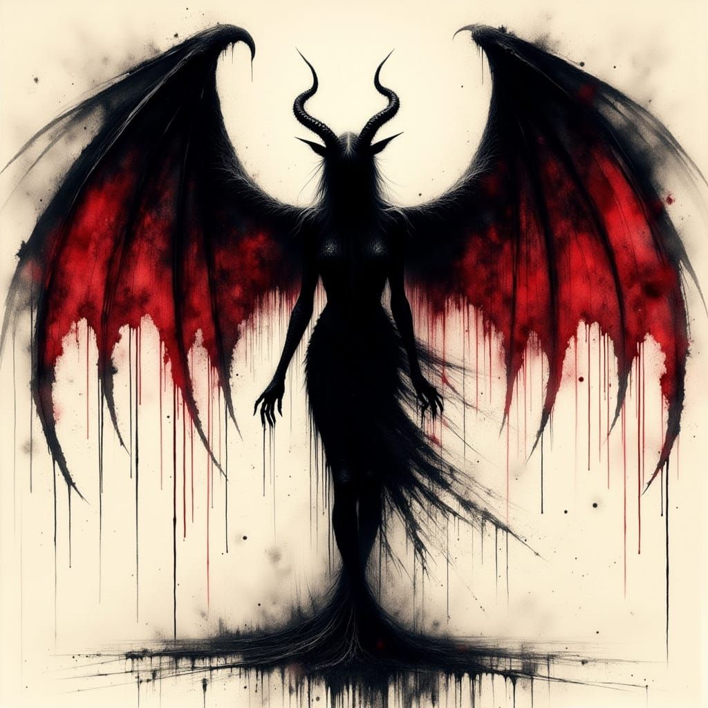 This haunting image features a silhouetted demonic female figure with massive black and blood-red wings, set against a textured monochromatic backdrop reminiscent of dark fantasy art. With a minimalist gothic composition, the image evokes a sense of dark feminine power and horror fantasy.