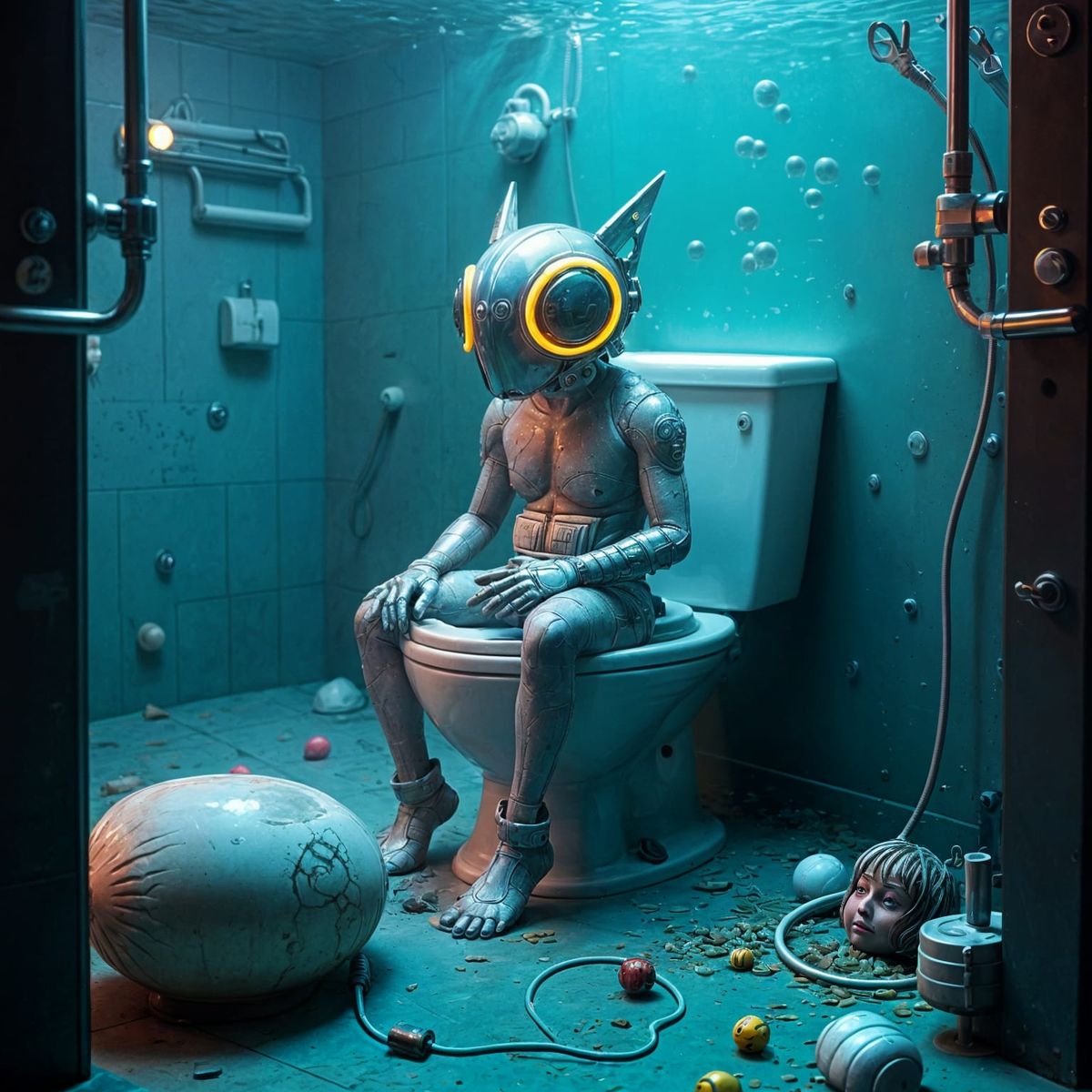 This image shows a bizarre creature made of biscuit, wearing a helmet, floating underwater near a toilet and balloon. The scene is rendered in a cyberpunk aesthetic.