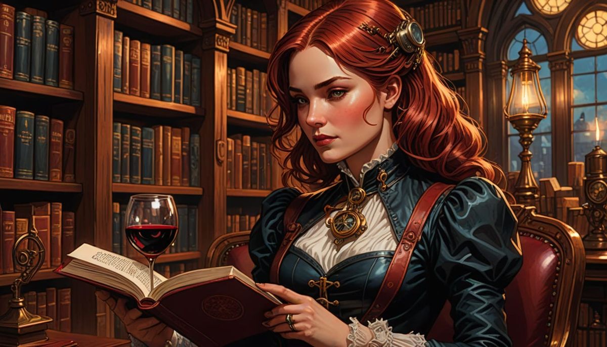This image shows a Victorian woman enjoying wine and a book in a library. The scene is rendered in a vibrant comic book art style, with soft golden lighting and a warm, inviting atmosphere.