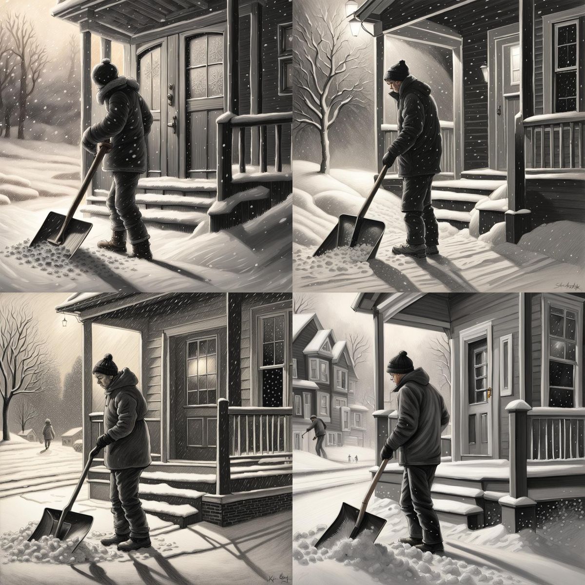 This hyperdetailed charcoal drawing advertises residential snow shovelling services during a snowfall. It offers a clear visual representation of winter cleanup assistance.