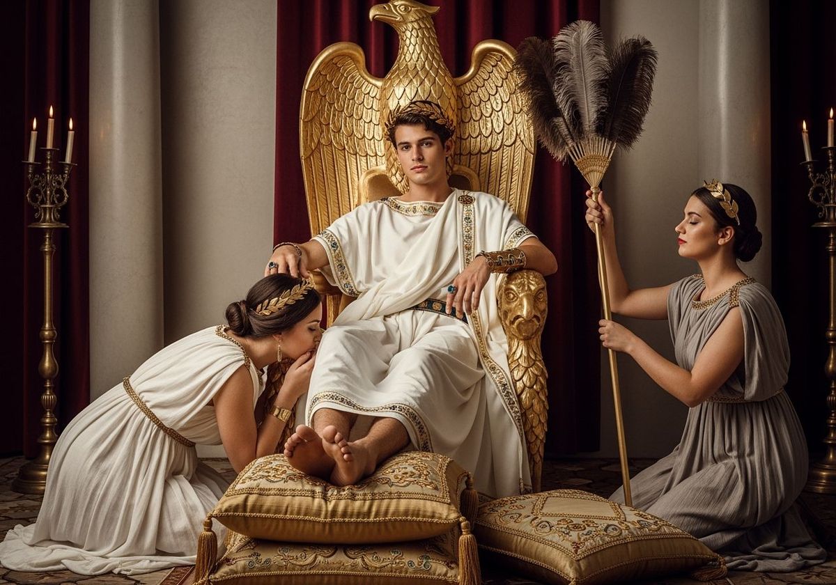 This image shows a young Roman emperor lounging on a golden throne in his palace. Servants attend to him in soft, natural lighting, reminiscent of classical Roman opulence and captured with a sharp focus.