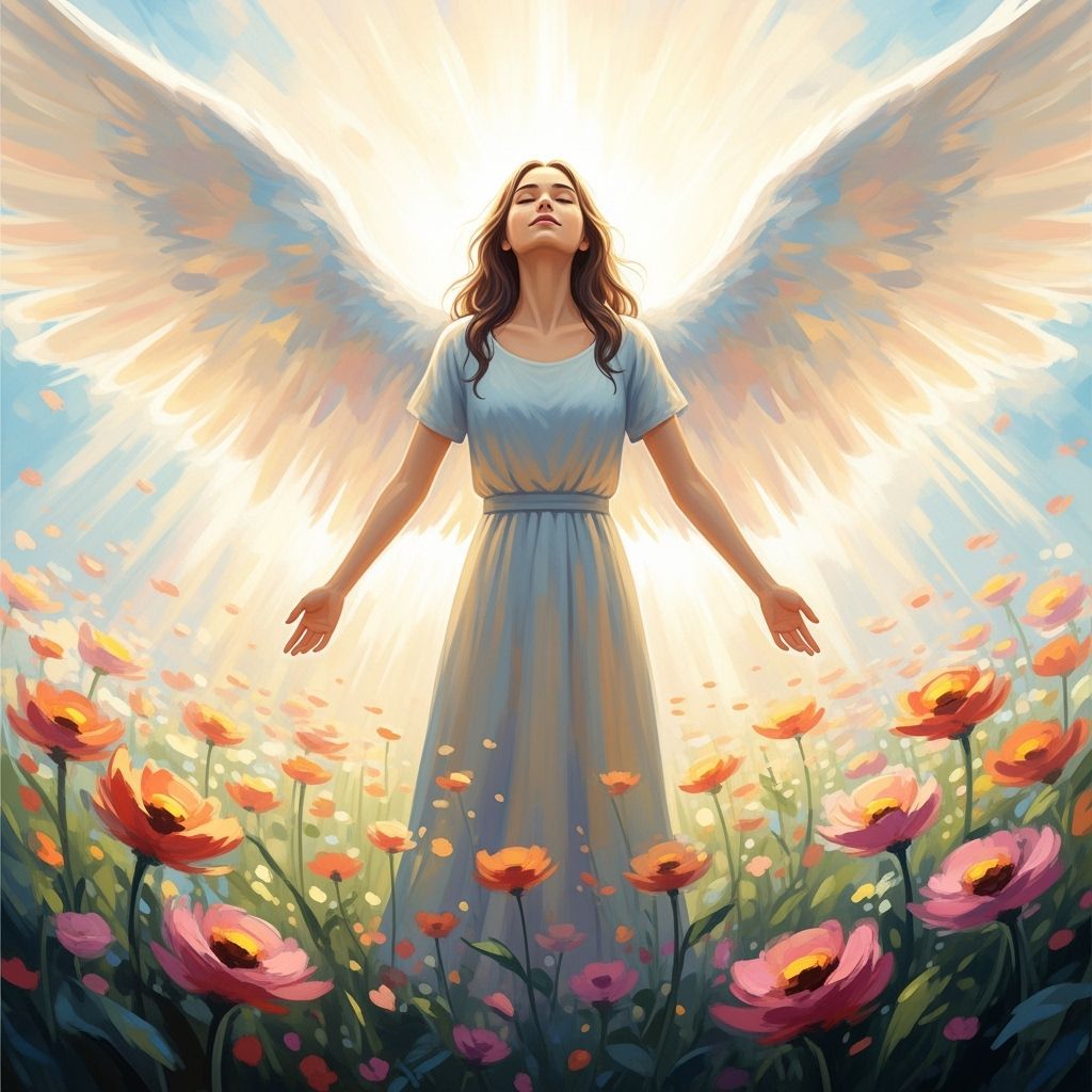 This image features a serene woman with angel wings in a field of impressionistic flowers. Rendered with loose brushstrokes and warm pastels, it evokes gentle love and emotional release.