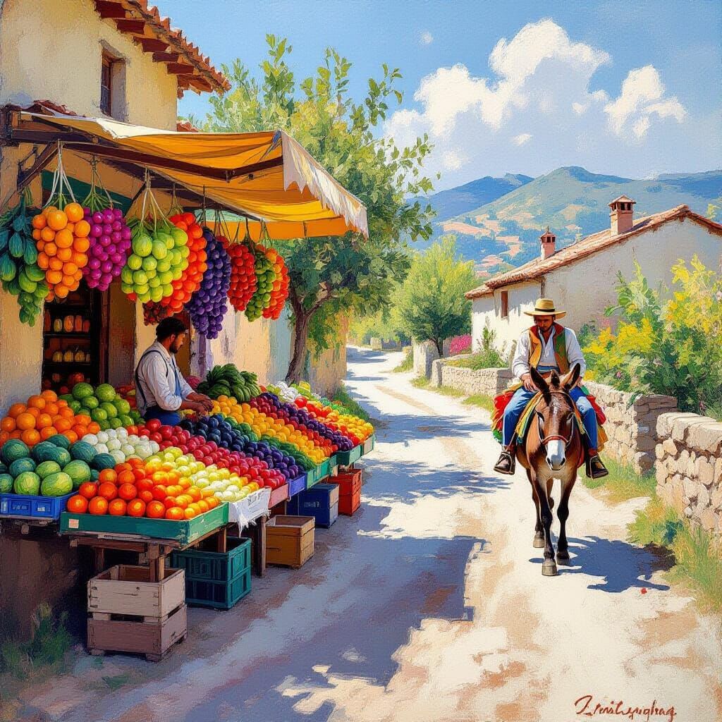 This image shows a vibrant fruit and vegetable stand beside a rural road. A man in traditional clothing rides a donkey in the background of this impressionistic scene, in the style of impressionist painting.