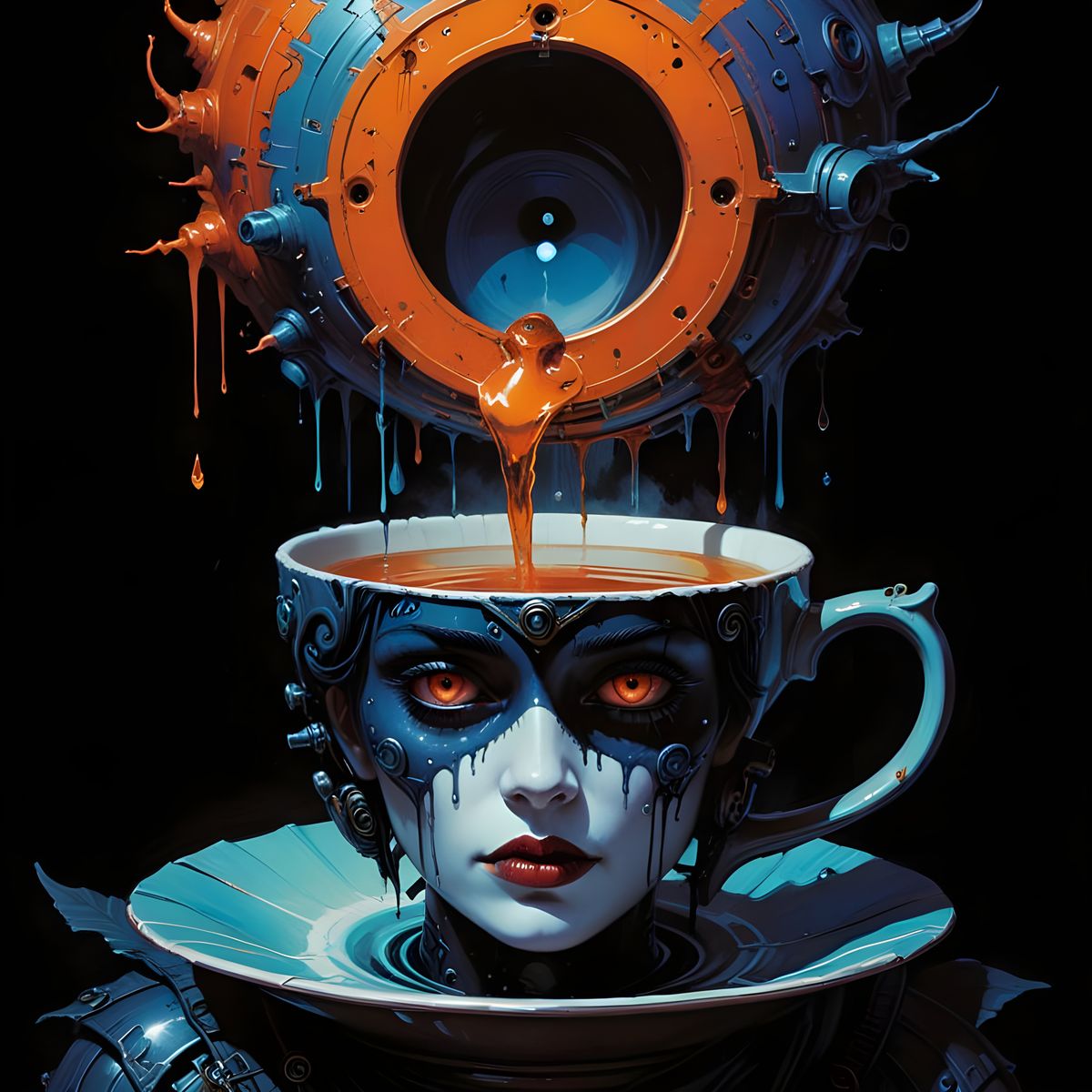 This image depicts a beautifully surreal cup overflowing with tears. The artwork is a blend of gothic, steampunk, and futuristic styles, creating an ominous yet serene atmosphere.