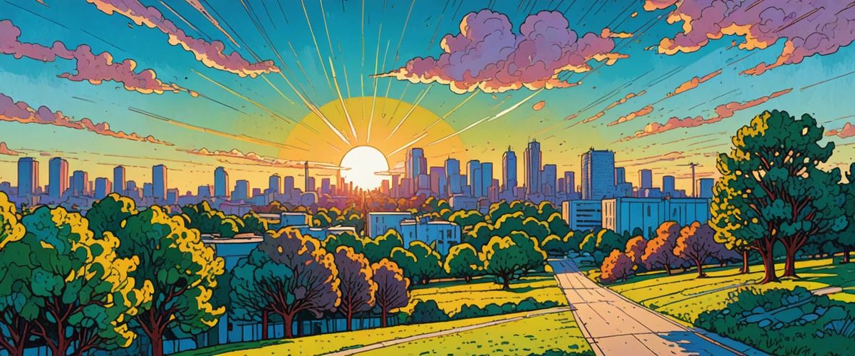 A vibrant image of an industrial park featuring trees and office buildings. Rendered in a gouache comic book style, the scene is bathed in warm sunlight with volumetric lighting and high contrast.