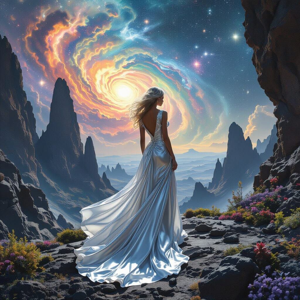 A captivating image of a celestial woman on an asteroid. She's adorned with starlight hair and a flowing gown, set against a backdrop of swirling galaxies and strange flora in a bold fashion editorial style.