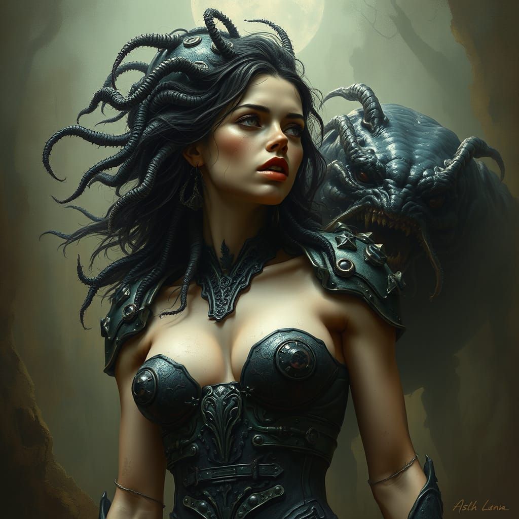 A surreal image of a woman with biomechanical armor being invaded by a tar monster. The dark fantasy art style evokes a haunting, mystical atmosphere.