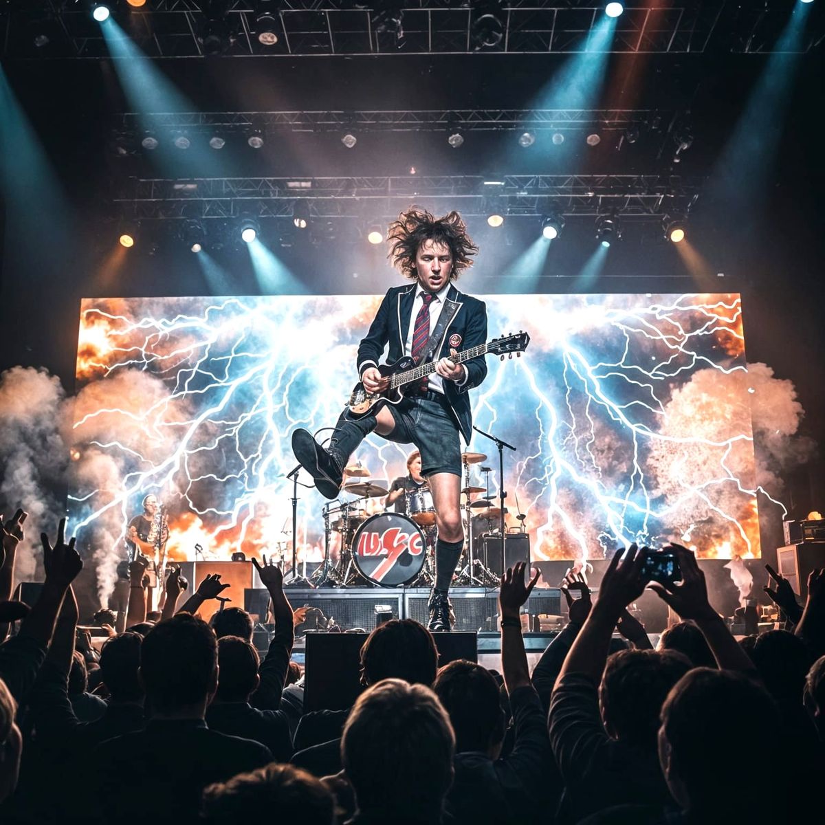 A dynamic image capturing AC/DC live in concert, featuring a lead guitarist in an English schoolboy outfit and dramatic background lightning.