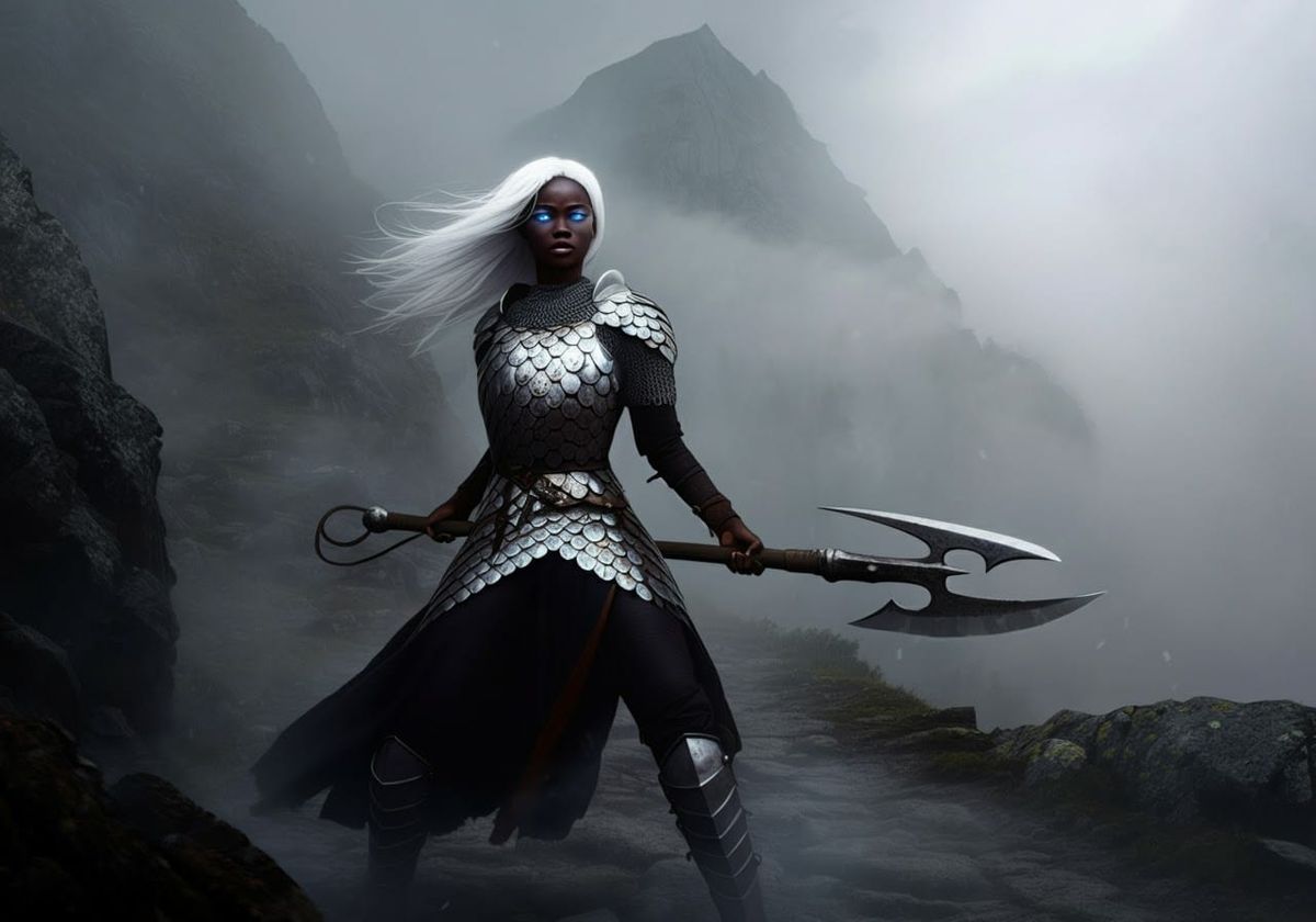 This image captures a striking young warrior standing tall on a rugged mountain path, her scale mail armor and intricately molded breast plate gleaming in the dramatic lighting. With a fierce gaze and razor-sharp glaive, she embodies determination and strength, set amidst a mist-shrouded landscape with s...
