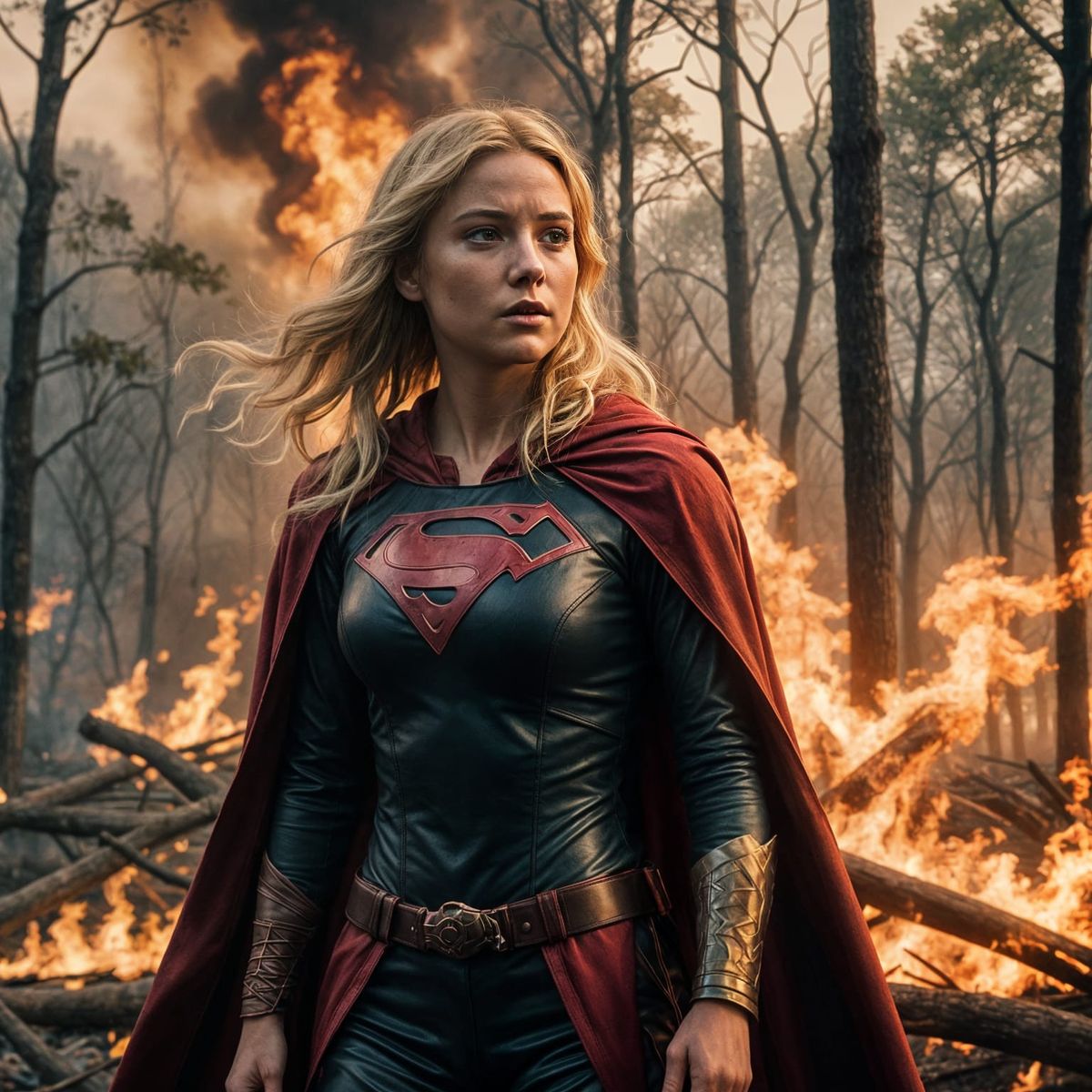 This image shows a blonde superheroine standing strong amid a raging wildfire. Her cape flows in the wind as she faces the flames with a determined expression, captured with cinematic lighting.