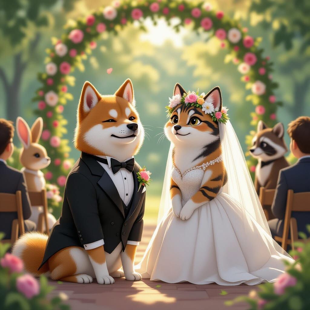 A whimsical wedding scene with a Shiba Inu groom and a tiger-striped cat bride. Forest creatures attend under soft sunlight in a style reminiscent of delicate, expressive character art.