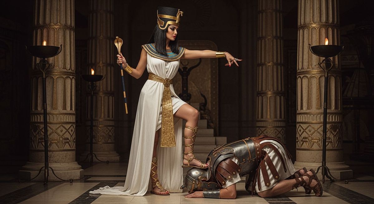 This image shows an Egyptian queen in a gold toga and cobra crown standing in her throne room. A Roman soldier bows before her as she rests her foot on his neck. The image has a professional photography style with natural lighting.