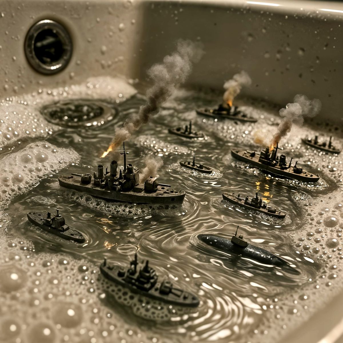This image shows a photorealistic miniature naval battle inside a kitchen sink. Tiny warships clash amidst soap suds and water ripples, with dramatic lighting emphasizing the scene's realism.