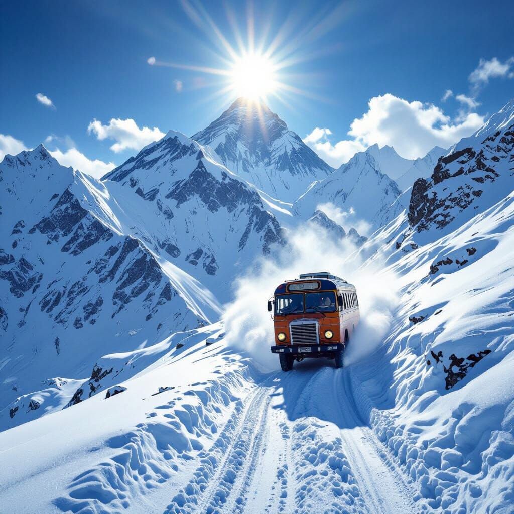 Generate unique images of buses on mountain roads, snowy scenes, or Everest expeditions. Free and easy AI image creation.