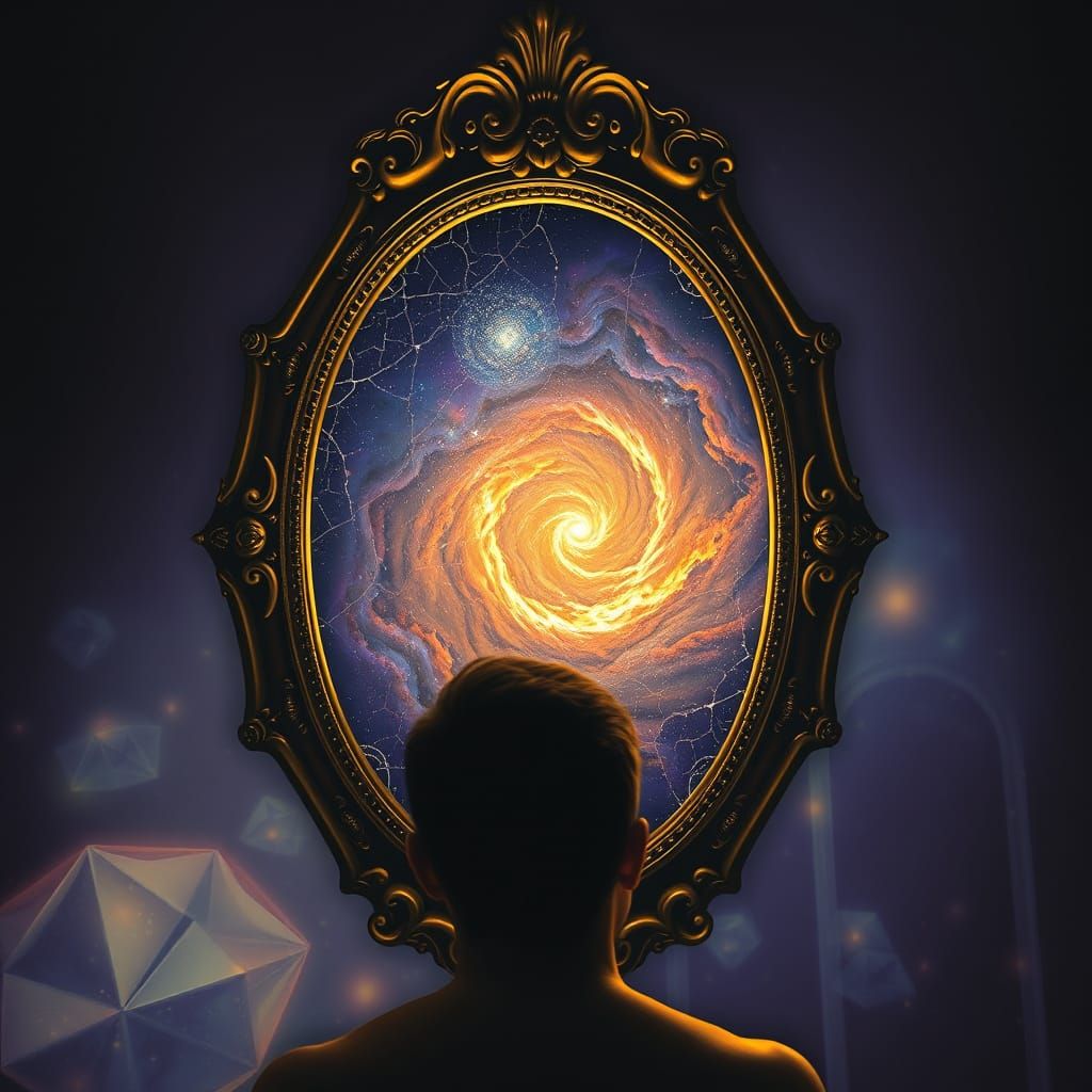 A person confronts a mirror showing a cosmic vortex, not their reflection, in a surreal chamber. The image uses dramatic lighting and a dreamlike, symbolic style.