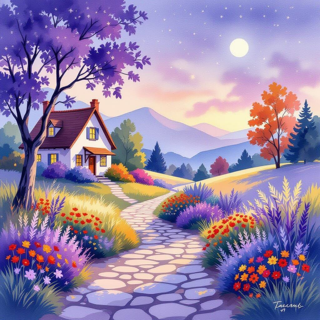 A soft, dreamy watercolor landscape dominated by purple, lavender, and violet tones. A gentle pebble path leads toward a warm, inviting cottage nestled among trees — one with violet leaves and flowers, another with orange foliage. Flower beds along the path feature vivid orange, deep violet, and warm red blooms, with only subtle blue accents. Soft green grasses are highlighted with touches of warm yellow. Distant rolling mountains lie under a calm, starry night sky with a gentle moon glow, carrying subtle purple and lavender gradients. A soft glowing lantern or porch light illuminates the cottage, adding warmth and magic. Pebbles on the path reflect moonlight slightly, creating a tranquil, cozy, and safe atmosphere.