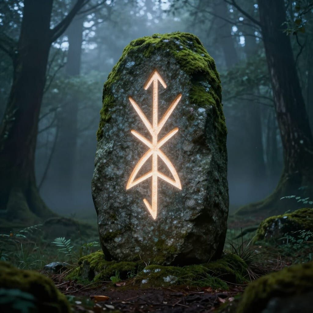 This dark fantasy concept art depicts an ancient, moss-covered stone in a foggy forest, marked with a glowing, mystical rune. Dramatic lighting and a vivid color palette create an ethereal atmosphere.