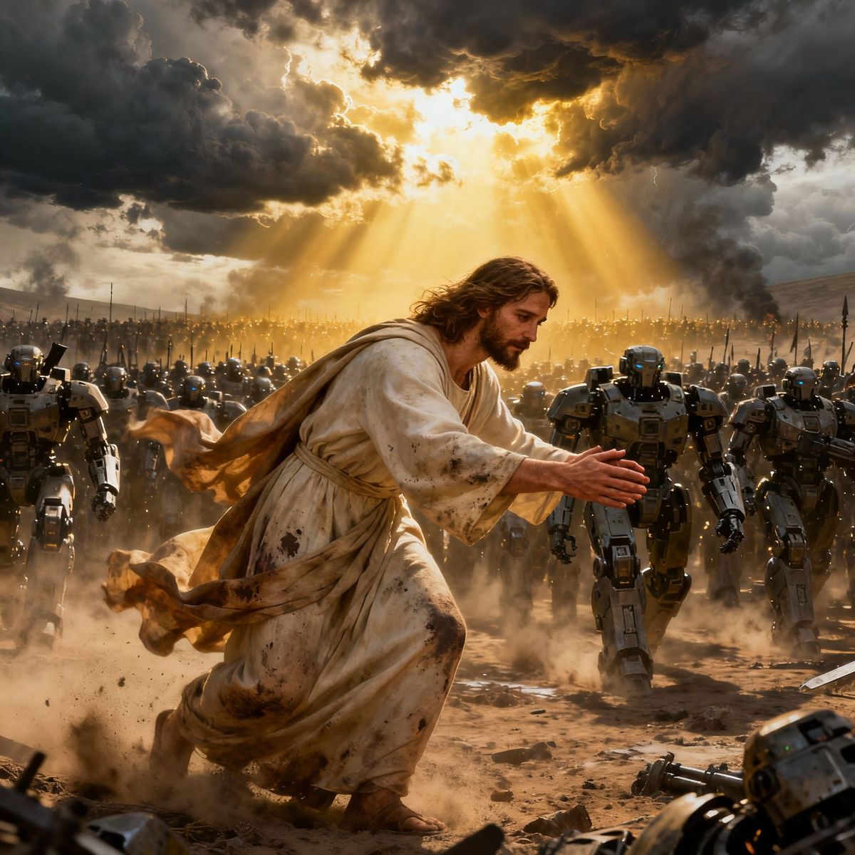 This ultra-realistic artwork depicts Jesus extending his hand in a loving embrace, his battle-worn clothes in motion. A vast robot army stands behind him as divine light breaks through stormy clouds.