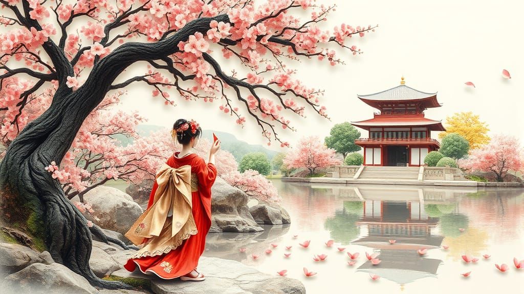 A delicate geisha stands by a blooming cherry tree and serene garden pond, crafted in the intricate style of Kirigami art with stunning watercolor hues.