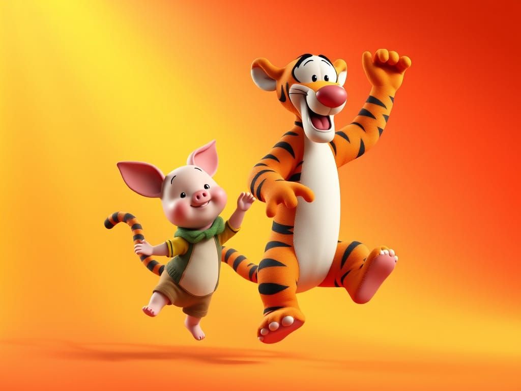 This image shows Tigger and Piglet joyfully playing against a vibrant backdrop. Rendered as 3D digital art, it captures a Pixar and Disney-inspired aesthetic with detailed shading and cinematic lighting.