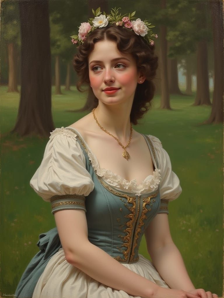 This oil painting depicts a refined young woman with a shy smile, set amidst a lush park scene. Created in the style of 19th-century European art, this piece showcases delicate brushstrokes and vivid colors.