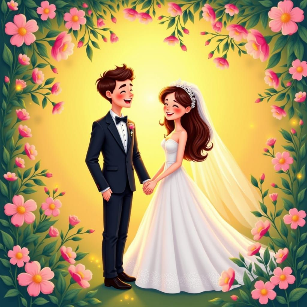 A joyful cartoon wedding couple holds hands in a whimsical garden. Rendered in a charming storybook illustration style with vibrant, delicate colors and soft golden-hour light.