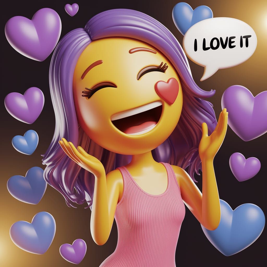 This image shows a cheerful emoji girl expressing joy. Rendered in bright, colorful 3D, she's surrounded by floating hearts in a whimsical digital artwork.