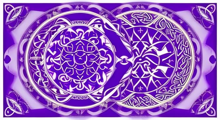 This image shows a fractal Scorpio design incorporating Celtic runes and chakra symbols. It features violet and white colors, suggesting a spiritual or astrological theme with armored elements.
